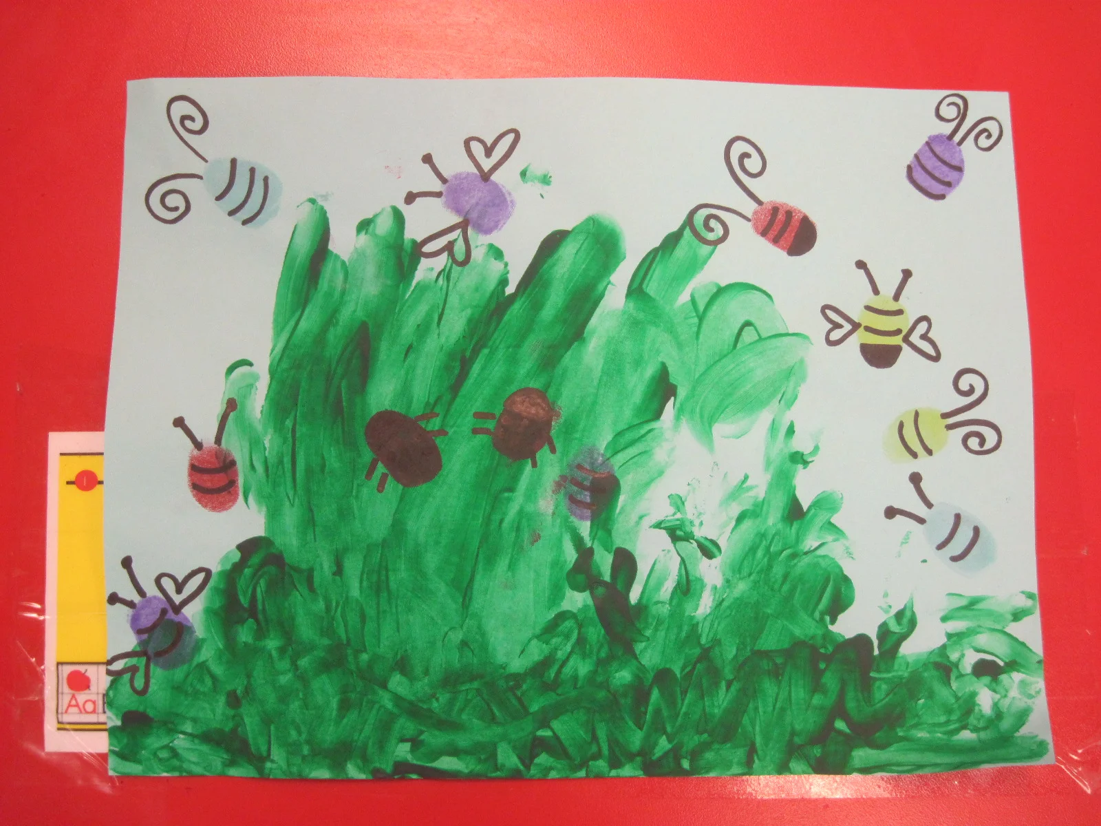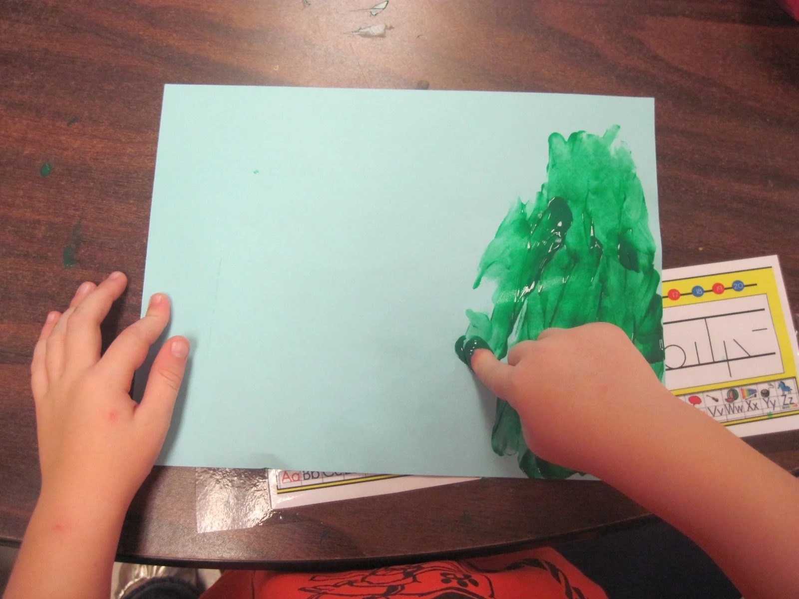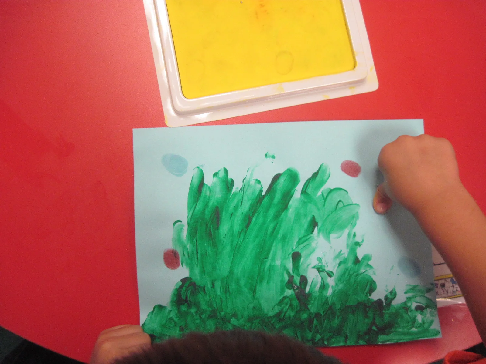 Sometimes in pre-k our plans get thrown out the window. Take today for example...we had it all planned out. Fun Friday...playing outside...playing musical chairs....going to centers. And then it changes....fingerpainting!!! It's magnet time at PLE and our artwork needed to be turned in by Monday morning...so fingerpainting it is.... First...we painted the grass... while we learned directional words top and bottom and opposites up and down.