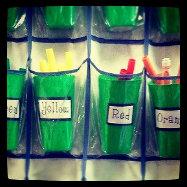 For projects that we do on our learning carpet we keep a class supply of markers and crayons in our art center. A shoe organizer and plastic cups...in pre-k world these items are marker and crayons organizers.